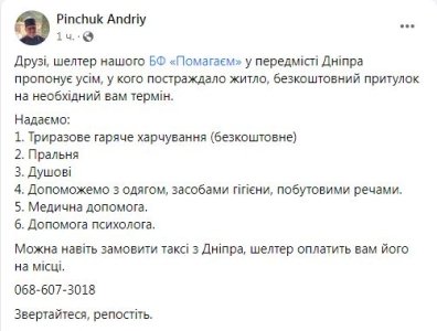 Добавим также, что глава наблюдательного совета благотворительного фонда "Помогаем" Андрей Пинчук сообщил, что их шелтер в пригороде Днепра может предоставить бесплатный приют всем пострадавшим от потери жилья. Для этого необходимо обратиться по номеру 068-607-30-18