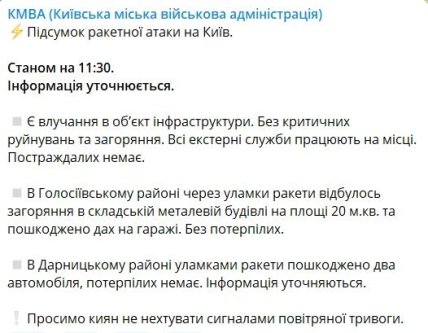 11:50 Первые итоги утренних ударов по Киеву – пострадавших предварительно нет, пишет КГВА.