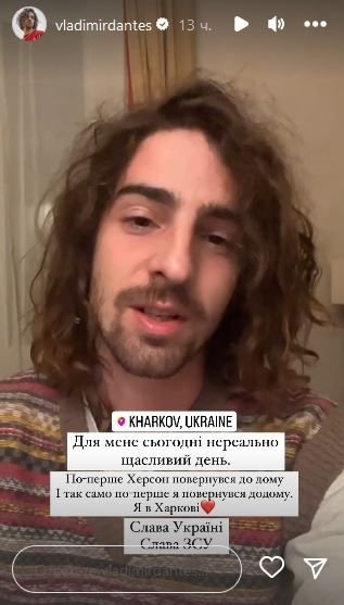 "Для меня сегодня нереально счастливый день. Потому что, во-первых, Херсон вернулся домой, и так же, во-первых, я вернулся домой. Я в Харькове", — сообщил Дантес в сторис.