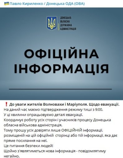 Глава Донецкой областной государственной администрации Павел Кириленко в 9 утра подтвердил: "В настоящее время имеем подтверждение режима тишины с 9:00. В эти минуты прорабатываем детали эвакуации".