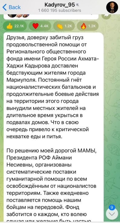 "Доверху забитый груз продовольственной помощи… Фонд заботится о каждом", — прокомментировал Кадыров так называемую "помощь" украинцам, над которыми и сами же издеваются, которых грабят и насилуют.
