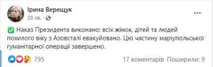 "Приказ Президента выполнен: все женщины, дети и пожилые люди из Азовстали эвакуированы. Эта часть мариупольской гуманитарной операции завершена", — написала Верещук.