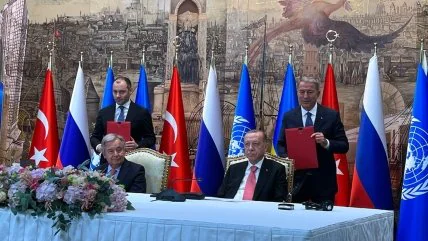 Напомним, в пятницу в Стамбуле Украина заключила соглашение с ООН и Турцией по экспорту зерна Черным морем через порты Одессы, Черноморска и Южного. рф заключила аналогичную сделку с Анкарой и ООН. Кроме того, россия отдельно договорилась с ООН по экспорту своих с/х товаров и удобрений.