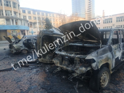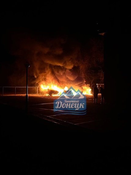 Также на Школьном загорелась крыша дома после обстрела, а посреди улицы в центре горят автомобили.