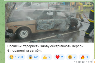 По данным Херсонской областной прокуратуры, число потерпевших еще уточняется, пока продолжается обстрел города. Как видно с фото прокуратуры, повреждена гражданская инфраструктура, загорелся автомобиль, обломки разбили стекло и пробили авто на стоянке. Прокуратура начала расследование по уголовному производству по факту нарушения законов и обычаев войны, соединенного с умышленным убийством (ч. 2 ст. 438 УК Украины).