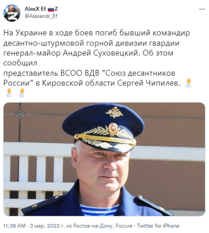 В сообществе российских десантников в Кировской области уже оплакивают свою "потерю". Однако твиттерские пользователи восприняли войну о ликвидации Суховецкого больше, чем радостно.