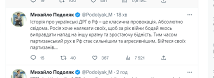 "История об украинских ДРГ в россии — это классическая провокация. Абсолютно сознательная. россия хочет испугать своих, чтобы за год войны хоть как-то оправдать нападение на другую страну и растущую бедность. Тем временем партизанское движение в россии становится сильнее и агрессивнее. Бойтесь своих партизан", – говорит Подоляк.