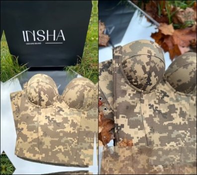 13 ноября там решили представить новинку, — корсет без бретелей из камуфляжной ткани, похожей на пиксель, из которого шьют форму для ВСУ.