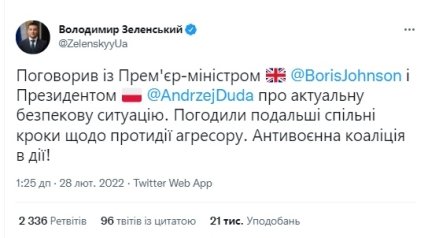 В пресс-службе Джонсона приводят слова Зеленского о том, что следующие 24 часа будут решающими для противодействия агрессору. Британский премьер в свою очередь подчеркнул, что сделает все возможное для обеспечения оборонной помощи со стороны Великобритании и союзников.