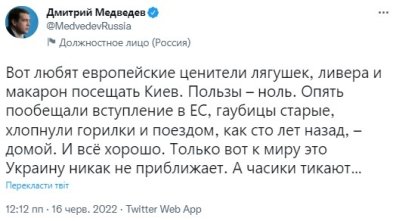 "Вот любят европейские ценители лягушек, ливера и макарон посещать Киев. Пользы – ноль. Опять пообещали вступление в ЕС, гаубицы старые, хлопнули горилки и поездом, как сто лет назад, – домой", — заявил медведев.