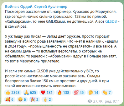 Об этом писал и военный журналист Сергей Ауслендер, отметив, что, возможно, ВСУ уже используют на поле боя дальнобойные ракеты GLSDB.