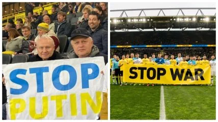Президент киевского клуба Игорь Суркис вместе с братом держали плакат: "Остановите Путина". Примечательно, что Григорий Суркис являлся депутатом от запрещенной пророссийской партии ОПЗЖ, которая годами была рупором кремля в Украине. Григорий является давним соратником Виктора Медведчука, с которым входил в партию СДПУ(о) еще з 1995 года. На парламентских выборах 2019 года Суркис был 17-м в списке ОПЗЖ.