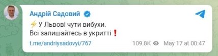 "У Львові чутно вибухи. Все залишайтеся в укриттях", — написав він, але не став давати подробиць.