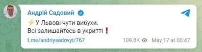"У Львові чутно вибухи. Все залишайтеся в укриттях", — написав він, але не став давати подробиць.