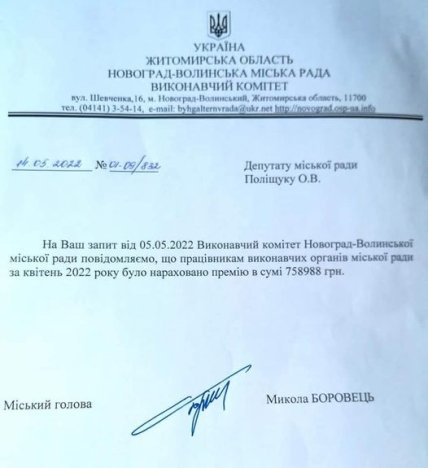 У якості підтвердження своїх слів про величезні премії жінка прикріпила офіційну відповідь від міського голови Миколи Боровця на запит місцевого депутата Поліщука О.В.