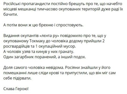 У п’ятницю, 2 вересня, на 191-й день повномасштабного вторгнення рф в Україну в росії повідомили про смерть росгвардійця в Токмаку (Запорізька область), якого нібито вбив "коригувальник ЗСУ".