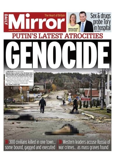 "Геноцид", "Різня невинних", "Путинська війна ганебних злочинів", "Жах у Бучі", "Гірше ніж ІДІЛ" — з такими заголовками та страшними кадрами зі звільненої Бучі вийшли топові світові ЗМІ 4 квітня.