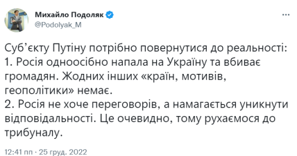 Офіційний Київ продовжує дотримуватися тези про те, що не зупиниться, доки останній російський солдат не буде вигнаний з усієї території. Реагуючи на чергову брехню диктатора, радник глави Офісу президента Михайло Подоляк у Twitter порадив путіну повернутися до реальності: