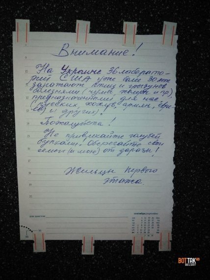 В одному з населених пунктів російської федерації жителі багатоповерхового будинку розмістили при вході до під'їзду оголошення для сусідів із проханням припинити підгодовувати голубів, адже саме цих птахів американці заражають надзвичайно небезпечними хворобами в українських біолабораторіях, аби в подальшому ті вбивали росіян, вірмен та євреїв.