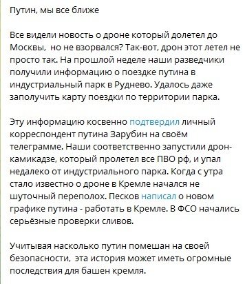 "Минулого тижня наші розвідники отримали інформацію про поїздку путіна в індустріальний парк "Руднєво". В результаті злетів наш дрон-камікадзе, який пролетів через усі засоби ППО росії і розбився неподалік промзони", — розповів він.