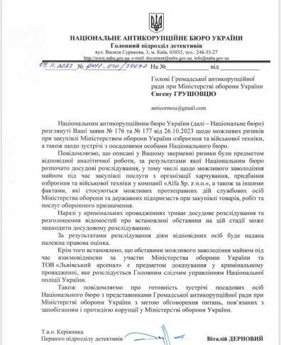 Сьогодні ми отримали лист, про те, що відносно одного з постачальників НАБУ вже здійснює розслідування, а відносно іншого таке розслідування здійснюється органами поліції", — йдеться в повідомленні.