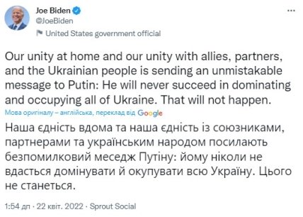 "Президент Зеленський та його демократично обраний уряд залишаються при владі, — наголосив американський лідер, — а українські збройні сили, до яких приєдналися відважні українські мирні жителі, зірвали завоювання росією їхньої країни".