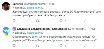 Звісно ж, користувачі мережі не змогли пройти повз таку новину. Деякі просто сміються із спроб росії відновити на території України філію Радянського Союзу, а інші кажуть, що загарбники не можуть виготовляти навіть власні авто — через брак сировини, яка недоступна через західні санкції.