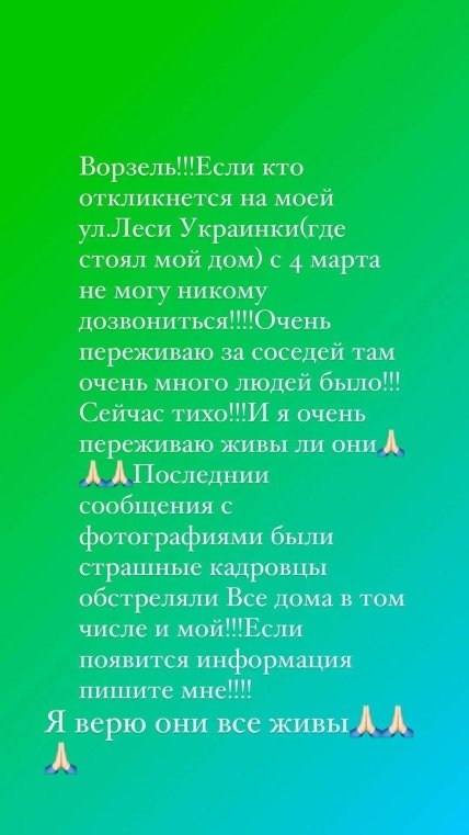 "Ворзель! Якщо хтось відгукнеться з моєю вул. Лесі Українки, де стояв мій будинок. З 4 березня не можу нікому додзвонитися. Дуже переживаю за сусідів. Там було дуже багато людей. Зараз тихо і я переживаю, чи вони живі. Останні повідомлення з фотографіями були страшні. Кадировці обстріляли всі будинки, у тому числі й мій. Якщо з’явиться інформація – пишіть мені. Я вірю, що вони всі живі", – написала Катерина.