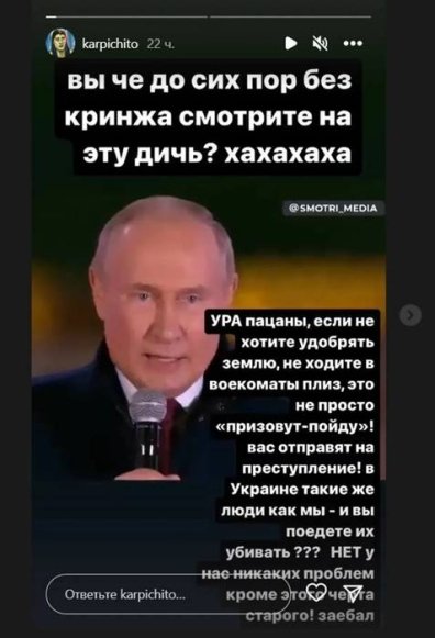 "Пацани, якщо не хочете удобрювати землю, не ходіть у військкомати. Вас відправлять на злочин. В Україні такі ж люди, як ви — і ви поїдете їх вбивати? Немає у нас жодних проблем, окрім цього чорта старого", — написала Надія Карпова, прикріпивши фото путіна.
