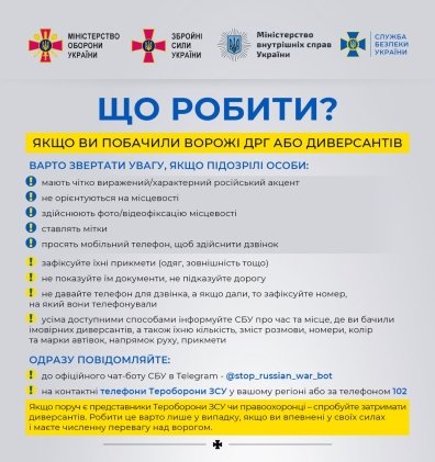 - усіма доступними способами інформуйте СБУ про час і місце, де ви бачили ймовірних диверсантів (прикмети, номери автомобілів, їх кількість, місцезнаходження).