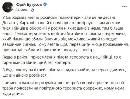 "Протягом доби нанесено суттєвих втрат особовому складу та техніці окупаційних військ: збито 4 вертольоти, 5 літаків та 1 БПЛА, здійснено кілька авіаційних нальотів на колони техніки противника, втрати уточнюються.