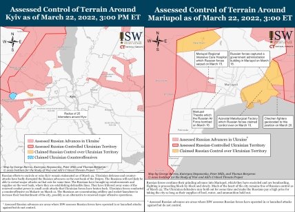 Фахівці Institute for the Study of War стверджують, що за добу 22 березня російські окупанти продовжували бомбардувати міста, але не йшли в наступ, — натомість українці самі успішно контратакували їх на київському напрямку та під Миколаєвом.