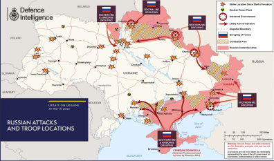 На мапі нижче наведено останню інформацію іноземних розвідників щодо бойових дій в Україні станом на середу, 30 березня 2022 року.
