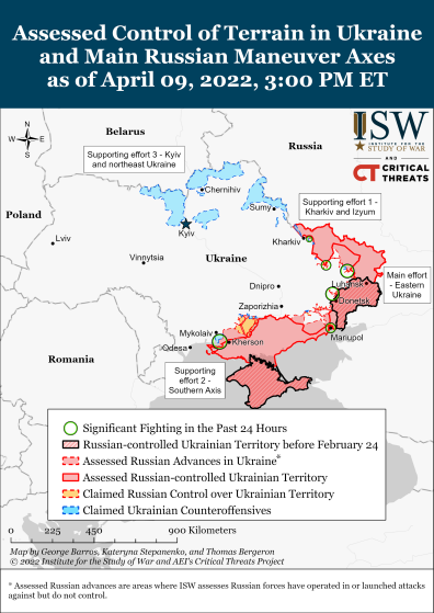 Станом на ранок 46-го дня війни в Україні, 10 квітня, російська армія все ще продовжує активні дії за двома напрямками фронту. Найгарячішими точками залишаються Харків, Ізюм та окремі населені пункти на Донбасі (схід), а також частково Миколаїв з Херсоном (південь).