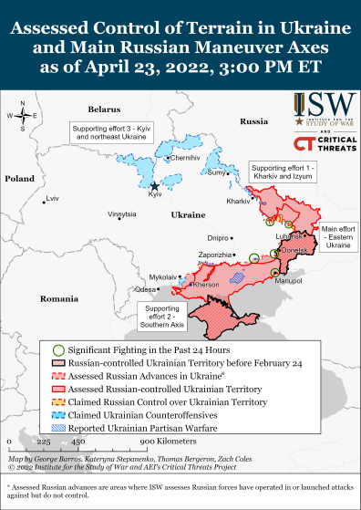 Російські війська продовжують атакувати із боку Ізюма. Попри успішний контрнаступ українських військ у Дергачівському районі, 23 квітня російські війська зберегли позиції на північний схід від Харкова, звідки вони ведуть обстріл міста. Керівництву армії окупантів важливо зберегти наземні лінії зв’язку від Білгорода до Ізюма, вони не проходять на околицях Харкова, а ближче до росії.