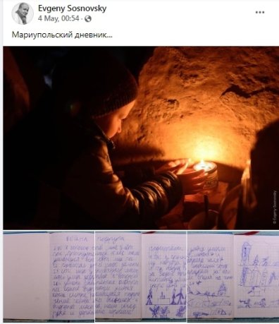 Опублікований на початку травня українським фотографом Євгеном Сосновським щоденник 8-річного хлопчика із міста-героя Маріуполя облетів усю мережу. Помер дідусь, два собаки і Маріуполь: пише, як бачить і відчуває, дитина. З першого дня повномасштабної війни хлопчик разом із мамою та 15-річною сестрою перебував у рідному місті. Усіх троє було поранено. На жаль, їм досі не вдалося виїхати у безпечніше місце.