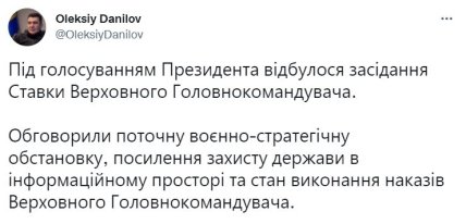 20:00 Зеленський провів засідання ставки верховного головнокомандувача, повідомив Данілов.