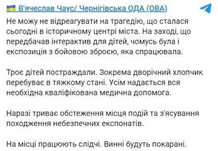 "На заході, що передбачав інтерактив для дітей, чомусь була і експозиція з бойовою зброєю, яка спрацювала. Троє дітей постраждали. Зокрема дворічний хлопчик перебуває в тяжкому стані. Усім надається вся необхідна кваліфікована медична допомога. Наразі триває обстеження місця подій та з'ясування походження небезпечних експонатів. На місці працюють слідчі. Винні будуть покарані", — написав він.