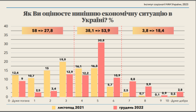 Переважна більшість жителів України вважає, що, попри війну складна економічна ситуація в країні все одно краща, аніж у листопаді 2021 року. Таку думку під час опитування, що було проведене представниками Київського міжнародного інституту соціології (КМІС) на замовлення Інституту соціології НАН, висловили більше третини українців.