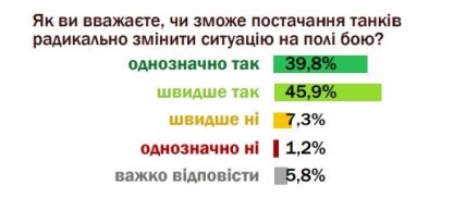 При цьому переважна українців упевнена, що сучасні європейські танки здатні переломити хід війни. Так, на запитання анкети "Чи зможе постачання танків радикально змінити ситуацію на полі бою?" дали однозначно ствердну відповідь 39,8% респондентів, радше погоджуються — 45,9%; радше ні — 7,3%; однозначно ні — 1,2%, не змогли відповісти — 5,8% опитаних.