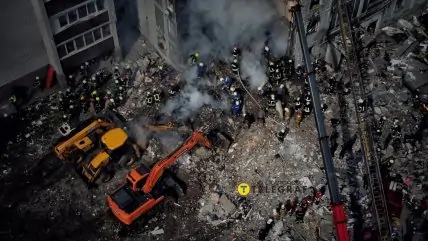 Кореспонденти "Телеграфа" продовжують перебувати на місці влучення російської ракети в Умані. Вони показали наслідки терористичної атаки з висоти пташиного польоту – руйнування жахають.