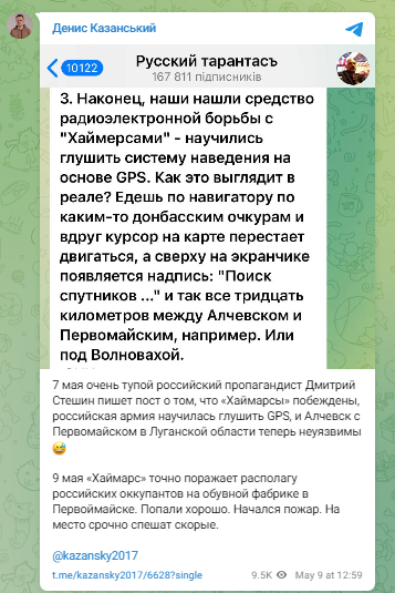 Зокрема, відомий український блогер Казанський звернув увагу на нещодавній пост пропагандиста Дмитра Стешина, який хвалився, нібито HIMARS "переможені", російська армія навчилася глушити GPS, а Алчевськ та Первомайськ нібито стали "невразливими".