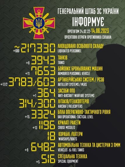17:00 Генсек НАТО Столтенберг назвав "очікуваними" втрати західної техніки під час настання ЗСУ на зміцнені російські позиції. Також він повідомив, що Альянс очікує 15 червня на доповідь від міністра оборони України.