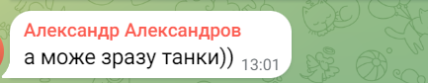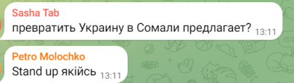 - "А у народу запитали? Може ми хочемо спокійно жити, а не кожен день бояться що цей сусід шизофренік опеньків нападе і триматиме зброї вдома";