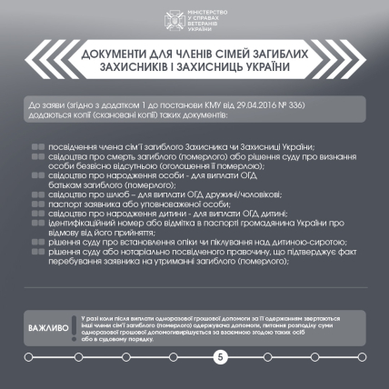 - Свідоцтво про смерть військового чи рішення суду про визнання його безвісти відсутнім (визнання загиблим).