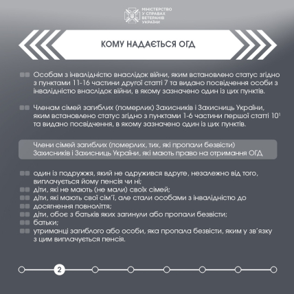 - Члени сімей загиблих військовослужбовців, які набули відповідного статусу та мають посвідчення.