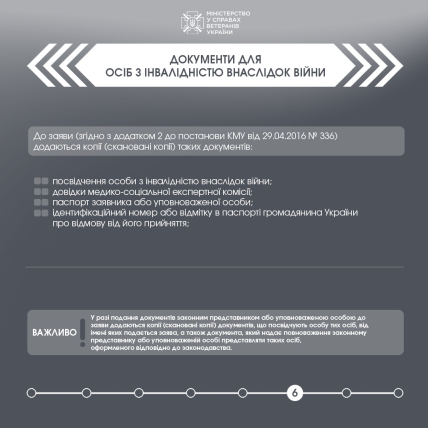 - Особи з інвалідністю мають надати посвідчення про інвалідність внаслідок війни, довідку лікарсько-соціальної експертної комісії, паспорт та ІПН.
