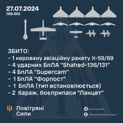 У ніч проти 27 липня російські окупанти атакували Україну керованою авіаційною ракетою Х-59/Х-69 та 11 різними безпілотниками. За інформацією Повітряних сил України, всі ворожі цілі були збиті.