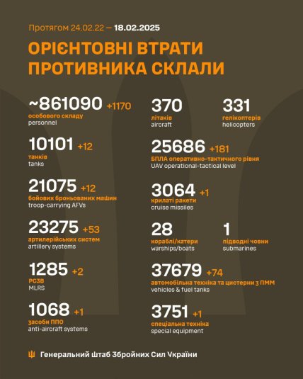 Про новини та події 17 лютого "Телеграф" розповідав тут:Хронологія війни — день 1090: росіяни тиснуть під Покровськом, а Трамп говорить про швидкі переговори