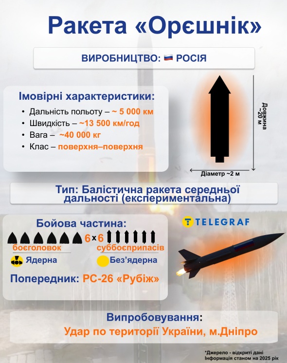 "Орєшнік" — російська балістична ракета середньої дальності, яка, за даними українських військових, здатна розвивати швидкість понад 12 300 км/год і оснащена шістьма бойовими частинами з суббоєприпасами.Президент Росії Володимир Путін 28 листопада 2024 року заявив, що серійне виробництво ракети вже розпочалося.